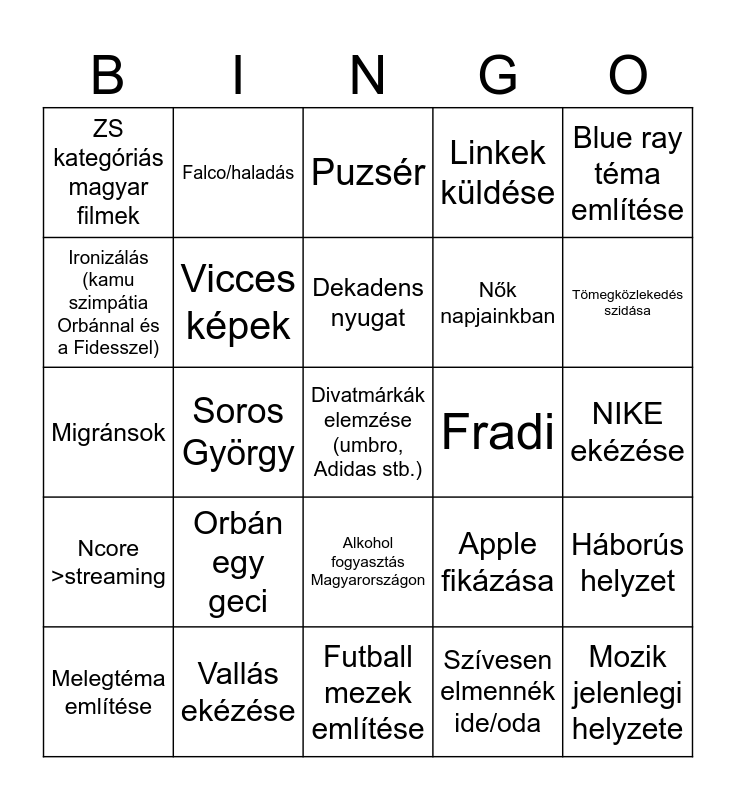 This bingo card has 25 words: Orbán egy geci, Futball mezek említése, Dekadens nyugat, Melegtéma említése, Blue ray téma említése, ZS kategóriás magyar filmek, Ironizálás (kamu szimpátia Orbánnal és a Fidesszel), Falco/haladás, Fradi, Alkohol fogyasztás Magyarországon, Nők napjainkban, Migránsok, Apple fikázása, Háborús helyzet, Vicces képek, Mozik jelenlegi helyzete, NIKE ekézése, Puzsér, Tömegközlekedés szidása, Soros György, Divatmárkák elemzése (umbro, Adidas stb.), Vallás ekézése, Ncore >streaming, Linkek küldése and Szívesen elmennék ide/oda.