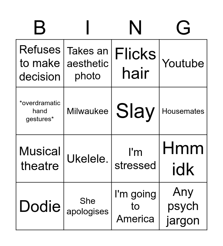 This bingo card has 16 words: She apologises, Hmm idk, Flicks hair, Refuses to make decision, Musical theatre, Takes an aesthetic photo, I'm stressed, I'm going to America, *overdramatic hand gestures*, Milwaukee, Dodie, Youtube, Ukelele., Housemates, Slay and Any psych jargon.