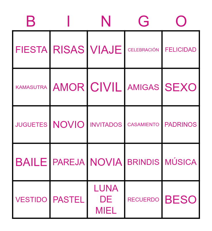 This bingo card has 30 words: PASTEL, RAMO, NOVIO, ANILLO, FIESTA, VIAJE, AMOR, NOVIA, CASAMIENTO, LUNA DE MIEL, PADRINOS, INVITADOS, RECUERDO, BESO, SEXO, LIGA, BRINDIS, BAILE, PAREJA, FELICIDAD, JUGUETES, NIÑOS?, RISAS, AMIGAS, KAMASUTRA, CELEBRACIÓN, MÚSICA, VESTIDO, CIVIL and ESPOSOS.