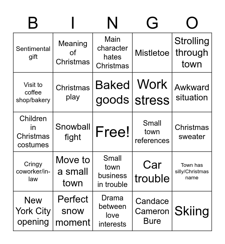 This bingo card has a free space and 80 words: Christmas tree decorating, Christmas tree lighting, Main character hates Christmas, Other character has crush on love interest, Eggnog, Christmas tree shopping, Kid needs help with something, Santa Claus, Big city boyfriend, Concerned parent/grandparent, Family heirloom, Talking about dead family member, Mistletoe, Sentimental gift, Main character welcomed home by old acquaintance, Visit to coffee shop/bakery, Some reveals their dream job, Move to a small town, Christmas party, Christmas sweater, Love interest is a widow, Strolling through town, Children in Christmas costumes, Baked goods, Christmas play, Childhood story, Smooching, Drive down snowy road, Relationship encouraged by someone, Drinking coffee, Awkward situation, Almost kiss, Drama between love interests, Secret identity, New York City opening, Small town references, Main character is a baker/ writer/ wedding planner, Ice skating, Sledding, Skiing, All dressed up, Quirky best friend, Misunderstood situation, Name another movie of the main character, Amnesia, Meaning of Christmas, Something clumsy happens, Everyone saves the day, Holiday memories, Doing something nice for others, Town has silly/Christmas name, Snowball fight, Car trouble, Christmas caroling, Decorating cookies, Love interest has child, Snowstorm, Hot chocolate, Christmas contest, Small town business in trouble, Work stress, Special ornament, Sitting on Santa’s lap, Flannel shirt, Magic, Welcome to town sign, Fundraiser, Candy cane, Job promotion, Red dress, Cringy coworker/in-law, Perfect snow moment, Small town mayor, Royalty, Lacey Chebert, Danica McKeller, Candace Cameron Bure, Wrapping presents, Wreath and Breakup.