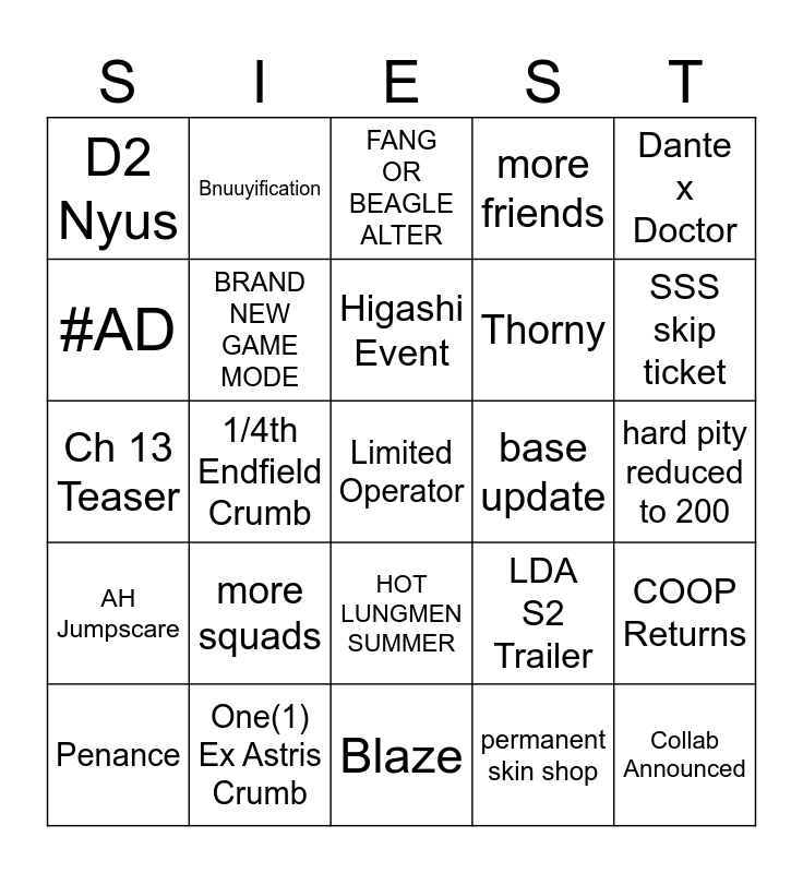 This bingo card has a free space and 24 words: more squads, One(1) Ex Astris Crumb, Higashi Event, Penance, Dante x Doctor, D2 Nyus, #AD, Bnuuyification, base update, HOT LUNGMEN SUMMER, Thorny, Ch 13 Teaser, LDA S2 Trailer, COOP Returns, BRAND NEW GAME MODE, permanent skin shop, hard pity reduced to 200, FANG OR BEAGLE ALTER, SSS skip ticket, 1/4th Endfield Crumb, Collab Announced, AH Jumpscare, more friends and Blaze.