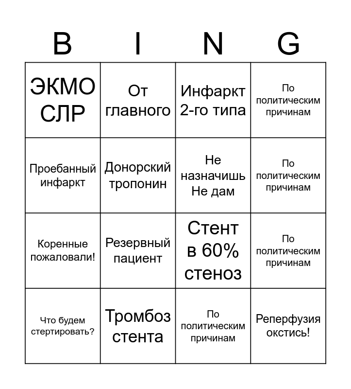 This bingo card has 20 words: По политическим причинам, Экспертное ЭХОКГ, Инфаркт 2-го типа, Ишемическая кардиомиопатия, Что будем стертировать?, Проебанный инфаркт, Тромбоз стента, ЭКМО СЛР, Коренные пожаловали!, От главного, Резервный пациент, Стент в 60% стеноз, Донорский тропонин, Реперфузия окстись!, Не назначишь Не дам, Да на n-ой койке просто дура лежит, По политическим причинам, По политическим причинам, По политическим причинам and По политическим причинам.