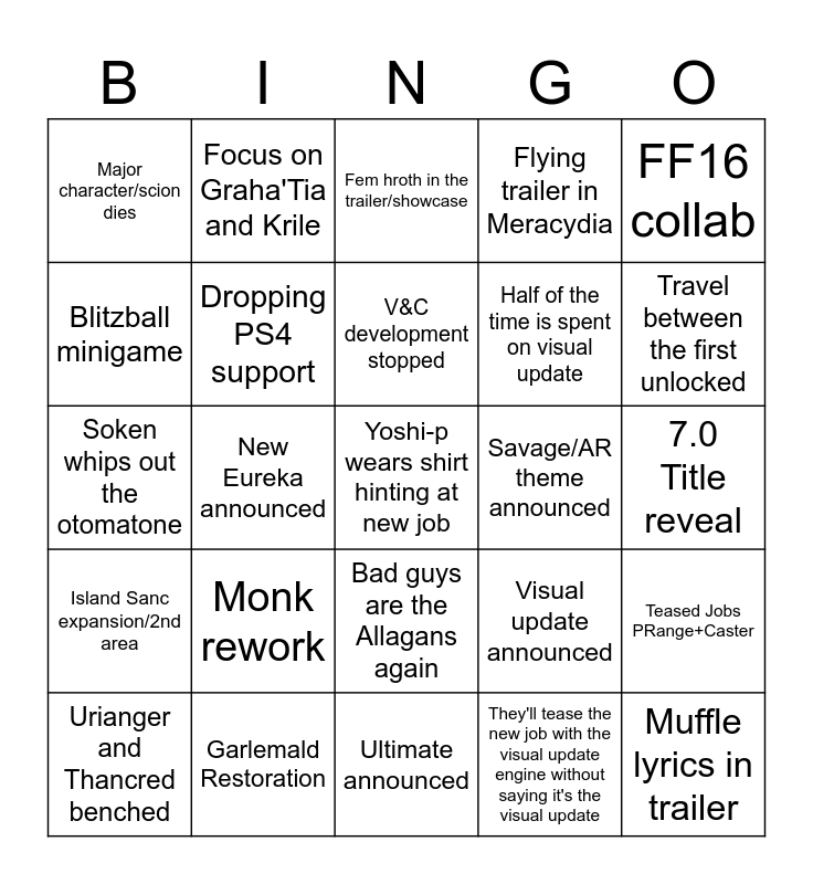 This bingo card has a free space and 24 words: Monk rework, Garlemald Restoration, V&C development stopped, Urianger and Thancred benched, FF16 collab, Major character/scion dies, Blitzball minigame, Focus on Graha'Tia and Krile, Savage/AR theme announced, Bad guys are the Allagans again, Half of the time is spent on visual update, Soken whips out the otomatone, Visual update announced, Teased Jobs PRange+Caster, Dropping PS4 support, They'll tease the new job with the visual update engine without saying it's the visual update, 7.0 Title reveal, Fem hroth in the trailer/showcase, Travel between the first unlocked, New Eureka announced, Muffle lyrics in trailer, Island Sanc expansion/2nd area, Flying trailer in Meracydia and Ultimate announced.