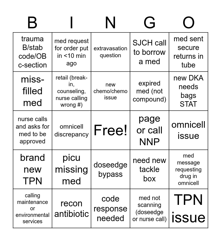 This bingo card has a free space and 49 words: compatibility question, TPN issue, stat alteplase, code response needed, picu missing med, nurse has <1 hour on a drip, med request for order put in <10 min ago, need med from central or nurse requesting item that comes from central, miss-filled med, page on call, retail (break-in, counseling, nurse calling wrong #), SJCH call to borrow a med, med message requesting drug in omnicell, need new tackle box, expired compound, smog compound, new chemo/chemo issue, page or call NNP, rec from a consult service, med sent secure returns in tube, omnicell discrepancy, med not scanning (doseedge or nurse call), trauma B/stab code/OB c-section, expired med (not compound), call from OR, new DKA needs bags STAT, calling maintenance or environmental services, pharm-is ticket, doseedge bypass, brand new TPN, new LOS/EOS orders, call from outside pharm to borrow med, tube shut down for full tube, request for vfc vaccine, recon antibiotic, ID home med, status board clear, request for on call electrolytes, omnicell issue, med message requesting med scanned into med bin, phone call from MD needing dose recommendation, critical dose warning override, need to make dilution narc, med stored improperly, nurse calls and asks for med to be approved, extravasation question, med room key needed, rework DE med and epic queue clear.