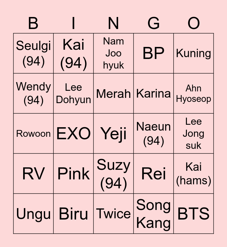 This bingo card has a free space and 24 words: Pink, Biru, Merah, Ungu, Kuning, Seulgi (94), Wendy (94), Kai (94), Naeun (94), Suzy (94), Karina, Rowoon, Rei, Kai (hams), Lee Dohyun, Song Kang, Lee Jong suk, Nam Joo hyuk, Ahn Hyoseop, EXO, BTS, RV, BP and Twice.