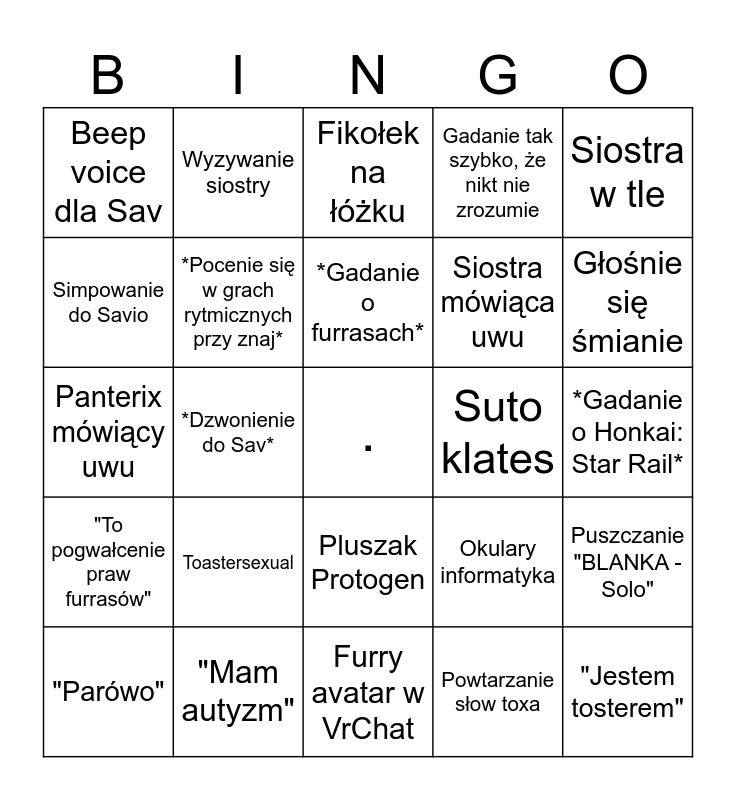 This bingo card has a free space and 24 words: Toastersexual, "Mam autyzm", *Gadanie o furrasach*, "Parówo", Siostra w tle, Beep voice dla Sav, Simpowanie do Savio, Wyzywanie siostry, Suto klates, Pluszak Protogen, Siostra mówiąca uwu, Panterix mówiący uwu, Okulary informatyka, Puszczanie "BLANKA - Solo", *Pocenie się w grach rytmicznych przy znaj*, Powtarzanie słow toxa, *Gadanie o Honkai: Star Rail*, Fikołek na łóżku, Głośnie się śmianie, *Dzwonienie do Sav*, "Jestem tosterem", "To pogwałcenie praw furrasów", Gadanie tak szybko, że nikt nie zrozumie and Furry avatar w VrChat.