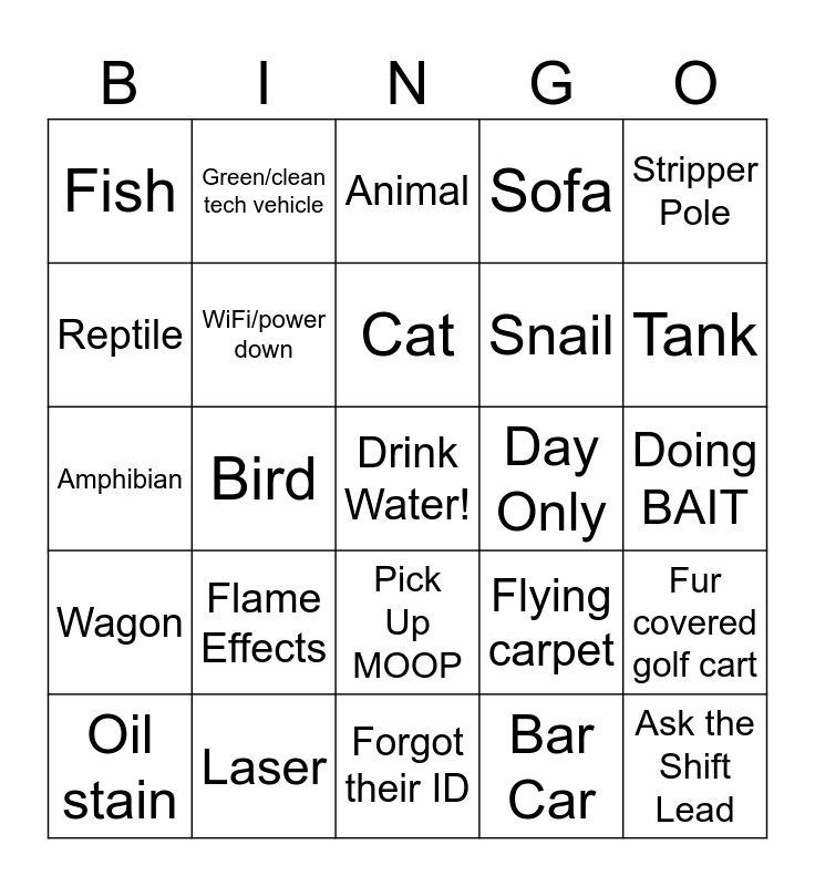 This bingo card has a free space and 55 words: Whiteout, Oil stain, Boat, Fish, Forgot their ID, Walk-up Registration, WiFi/power down, El Pulpo Mechanico, Snail, RobotHeart, Sofa, Chair, Furniture car, Dragon, Spaceship, The Monaco, Stripper Pole, Bird, Shark, Ask the Shift Lead, Day Only, Night Only, Flying carpet, Animal, Tiki, Cat, Bar Car, Walking Vehicle, Doing BAIT, Fur covered golf cart, Robot, Remote Pilot, Insect, Mammal, Reptile, Amphibian, Crustacean, Wagon, Motorboat, Gifts Food, Green/clean tech vehicle, Bed, Cloud, Walkers/Spotters, Flame Effects, Laser, SWAG!, Animal You’ve Eaten, Mythical Creature, Tank, Someone’s looking for Sparky, They drop Juke’s name, Has a trailer, Pick Up MOOP and Saloon.
