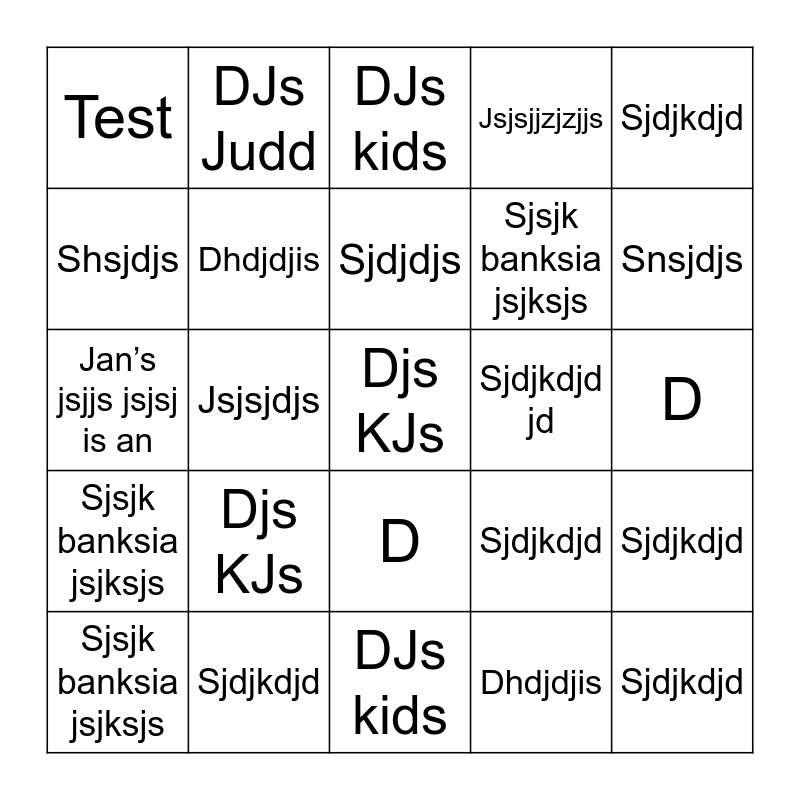 This bingo card has 164 words: Free!, Test, 5, D, D, Fffusheje, Dhdjdjis, DJs Judd, Snsjdjs, Sjdjdjs, Shsjdjs, Djs KJs, DJs kids, Sjdjdjsk, Sjdjkdjd, Sjdjkdjd, Sjdjkdjd, Sjsjk banksia jsjksjs, Jan’s jsjjs jsjsj is an, Test, 5, D, D, Fffusheje, Dhdjdjis, DJs Judd, Snsjdjs, Sjdjdjs, Shsjdjs, Djs KJs, DJs kids, Sjdjdjsk, Sjdjkdjd, Sjdjkdjd, Sjdjkdjd, Sjsjk banksia jsjksjs, Jan’s jsjjs jsjsj is an, Test, 5, D, D, Fffusheje, Dhdjdjis, DJs Judd, Snsjdjs, Sjdjdjs, Shsjdjs, Djs KJs, DJs kids, Sjdjdjsk, Sjdjkdjd, Sjdjkdjd, Sjdjkdjd, Sjsjk banksia jsjksjs, Jan’s jsjjs jsjsj is an, Test, 5, D, D, Fffusheje, Dhdjdjis, DJs Judd, Snsjdjs, Sjdjdjs, Shsjdjs, Djs KJs, DJs kids, Sjdjdjsk, Sjdjkdjd, Sjdjkdjd, Sjdjkdjd, Sjsjk banksia jsjksjs, Jan’s jsjjs jsjsj is an, Test, 5, D, D, Fffusheje, Dhdjdjis, DJs Judd, Snsjdjs, Sjdjdjs, Shsjdjs, Djs KJs, DJs kids, Sjdjdjsk, Sjdjkdjd, Sjdjkdjd, Sjdjkdjd, Sjsjk banksia jsjksjs, Jan’s jsjjs jsjsj is an, Test, 5, D, D, Fffusheje, Dhdjdjis, DJs Judd, Snsjdjs, Sjdjdjs, Shsjdjs, Djs KJs, DJs kids, Sjdjdjsk, Sjdjkdjd, Sjdjkdjd, Sjdjkdjd, Sjsjk banksia jsjksjs, Jan’s jsjjs jsjsj is an, Test, 5, D, D, Fffusheje, Dhdjdjis, DJs Judd, Snsjdjs, Sjdjdjs, Shsjdjs, Djs KJs, DJs kids, Sjdjdjsk, Sjdjkdjd, Sjdjkdjd, Sjdjkdjd, Sjsjk banksia jsjksjs, Jan’s jsjjs jsjsj is an, Test, 5, D, D, Fffusheje, Dhdjdjis, DJs Judd, Snsjdjs, Sjdjdjs, Shsjdjs, Djs KJs, DJs kids, Sjdjdjsk, Sjdjkdjd, Sjdjkdjd, Sjdjkdjd, Sjsjk banksia jsjksjs, Jan’s jsjjs jsjsj is an, Jsjsjdjs, Sjdjkdjd shush’s shush, Jd jd, Sjdjkdjd jd, Jdjsjdj, Jdjsjdj, Jdjsjdj, Jdjsjdj, Jd, Jdjsjdj, Jsjsjjzjzjjs, Jan’s, Jsjzjzjjzjzj, Jdjfiejjejw, JznzjJ, Jdjsjdj, Jdjsjdj, Jdjsjdj and Jsjsj.
