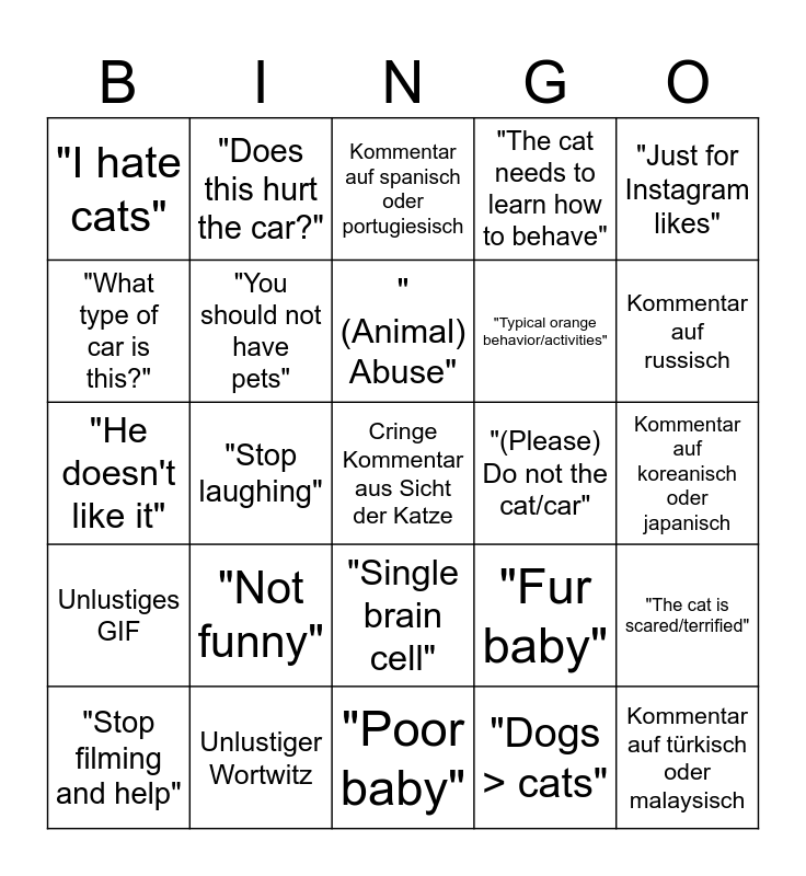 This bingo card has 25 words: "Not funny", "Poor baby", "(Animal) Abuse", "Stop filming and help", "Just for Instagram likes", "I hate cats", "What type of car is this?", "Does this hurt the car?", "(Please) Do not the cat/car", "Single brain cell", "Typical orange behavior/activities", "He doesn't like it", "Fur baby", "The cat is scared/terrified", "You should not have pets", Kommentar auf türkisch oder malaysisch, Kommentar auf koreanisch oder japanisch, Kommentar auf spanisch oder portugiesisch, Kommentar auf russisch, "Stop laughing", Cringe Kommentar aus Sicht der Katze, Unlustiger Wortwitz, Unlustiges GIF, "The cat needs to learn how to behave" and "Dogs > cats".