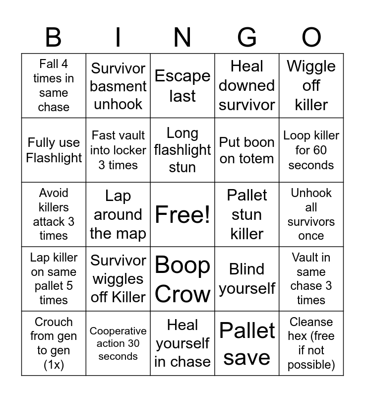 This bingo card has a free space and 90 words: Blind the killer, Boop the killer, Boop Crow, Do a gen (solo), CJ Tech, Crouch Tech, Window Tech, Bush Tech, Tree Tech, Reset Pallet, Use no perks (perks on), Boop Survivor, Heal all survivors once, Unhook all survivors once, Jumpscare killer, Long flashlight stun, Pallet Tech, Unhook survivor, Heal survivor, Use exhaustion perk twice in chase, Heal yourself, Get out of exhausted in chase, Heal yourself in chase, Get 3 Great Skill checks on the same gen, Avoid killers attack 3 times, Cooperative action 30 seconds, Fail 3 skill checks in a row, Do a gen with another survivor, FOV Tech, Escape with hatch, Lap shack 10 times, Vault in same chase 3 times, Stay in killer radius for 30 seconds without getting caught, Lap killer on same pallet 5 times, Fall 4 times in same chase, Heal downed survivor, Escape last, Distract killer from another survivor, Lap around the map, Loop killer for 60 seconds, Crouch from gen to gen (1x), Fully use Flashlight, Escape, Fully use Toolbox, Fully use Map, Blind yourself, Kobe, Fully use 2 items, Destroy all totems, Take 2 Protection Hits, Fully use Medkit, Put boon on totem, Heal survivor in chase, Get all Max Emblems, Get highest score, Get 1 Max Emblem, Pallet stun killer, 99 Gen, Open exit gate, Finish a Challenge, Get AFK Crow, T-Bag killer, Escape chase, Block a survivor and get them hit, Peace with the killer, Escape chase without being hit, Locker tech, Pallet save, Flashlight save, Escape with an item, Survivor wiggles off Killer, Cleanse hex (free if not possible), Unlock all chests, Unlock basement chest (else free), Survivor basment unhook, Fast vault into locker 3 times, Waste a pallet, Throw 2 pallets in chase, 360 killer, Moonwalk, Sabo hook infront of killer, Wiggle off killer, Iridescent Evader, Iridescent Benevolent, Iridescent Unbroken, Iridescent Lightbringer, Fully use a key, Become the obsession, Sabo a hook and Get healed from downed.
