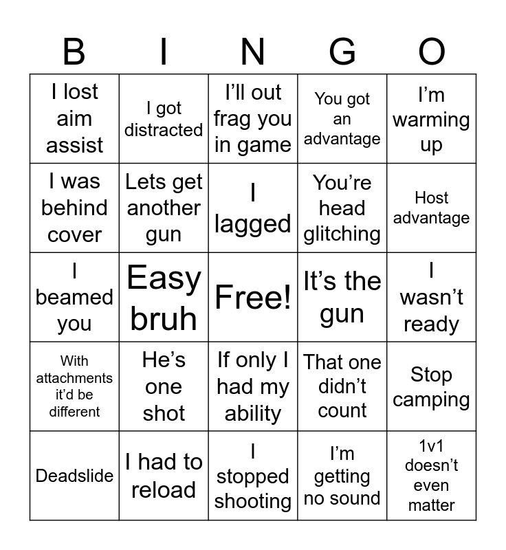 This bingo card has a free space and 24 words: He’s one shot, I had to reload, I lagged, Deadslide, I’m warming up, I lost aim assist, I was behind cover, I got distracted, It’s the gun, If only I had my ability, You’re head glitching, I beamed you, That one didn’t count, Stop camping, Lets get another gun, I’m getting no sound, I wasn’t ready, I’ll out frag you in game, Host advantage, Easy bruh, 1v1 doesn’t even matter, With attachments it’d be different, You got an advantage and I stopped shooting.