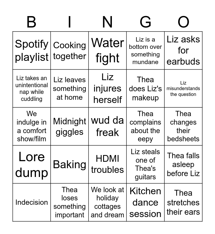 This bingo card has a free space and 24 words: Baking, Thea loses something important, Liz injures herself, Indecision, Liz asks for earbuds, Spotify playlist, Liz takes an unintentional nap while cuddling, Cooking together, Thea complains about the eepy, HDMI troubles, Thea does Liz's makeup, We indulge in a comfort show/film, Liz steals one of Thea's guitars, Thea falls asleep before Liz, Liz leaves something at home, Kitchen dance session, Thea changes their bedsheets, Water fight, Liz misunderstands the question, Midnight giggles, Thea stretches their ears, Lore dump, Liz is a bottom over something mundane and We look at holiday cottages and dream.