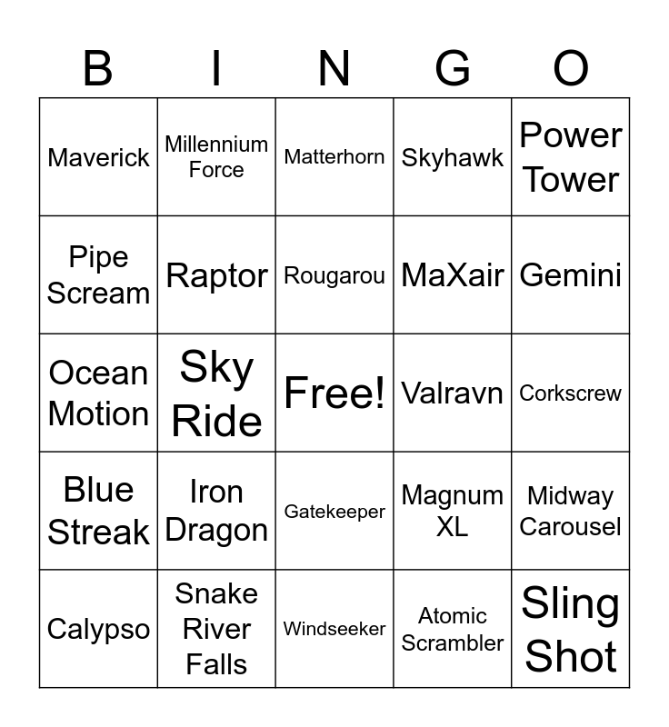 This bingo card has a free space and 24 words: Iron Dragon, Snake River Falls, Rougarou, Calypso, Power Tower, Maverick, Pipe Scream, Millennium Force, Valravn, Gatekeeper, MaXair, Ocean Motion, Magnum XL, Midway Carousel, Raptor, Atomic Scrambler, Corkscrew, Matterhorn, Gemini, Sky Ride, Sling Shot, Blue Streak, Skyhawk and Windseeker.