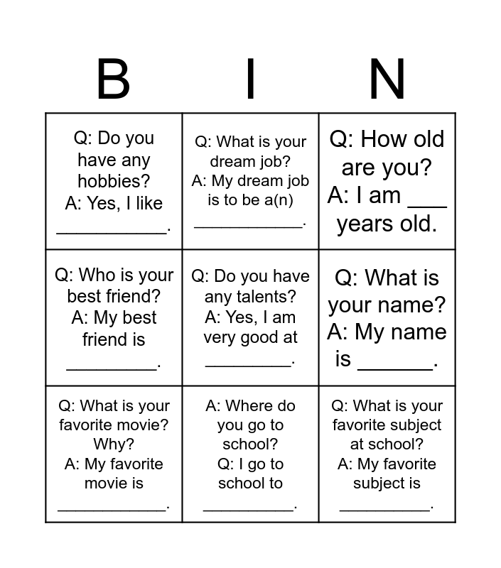This bingo card has a free space and 8 words: Q: What is your name? A: My name is ______., Q: How old are you? A: I am ___ years old., Q: What is your dream job? A: My dream job is to be a(n) ____________., Q: What is your favorite movie? Why? A: My favorite movie is ____________., Q: Do you have any hobbies? A: Yes, I like ___________., Q: What is your favorite subject at school? A: My favorite subject is __________., Q: Who is your best friend? A: My best friend is _________. and A: Where do you go to school? Q: I go to school to __________..