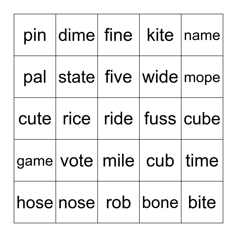This bingo card has 54 words: Free!, game, theme, late, mile, kite, kite, pale, pal, pine, pin, lace, nose, hose, robe, rob, ride, wide, wise, cube, cub, fuse, fuss, name, date, dime, dim, dome, tote, bone, tame, stove, same, note, fine, fume, cute, time, bite, state, shine, shin, pride, joke, vote, lime, puke, grape, five, rice, mope, mop, code and fame.