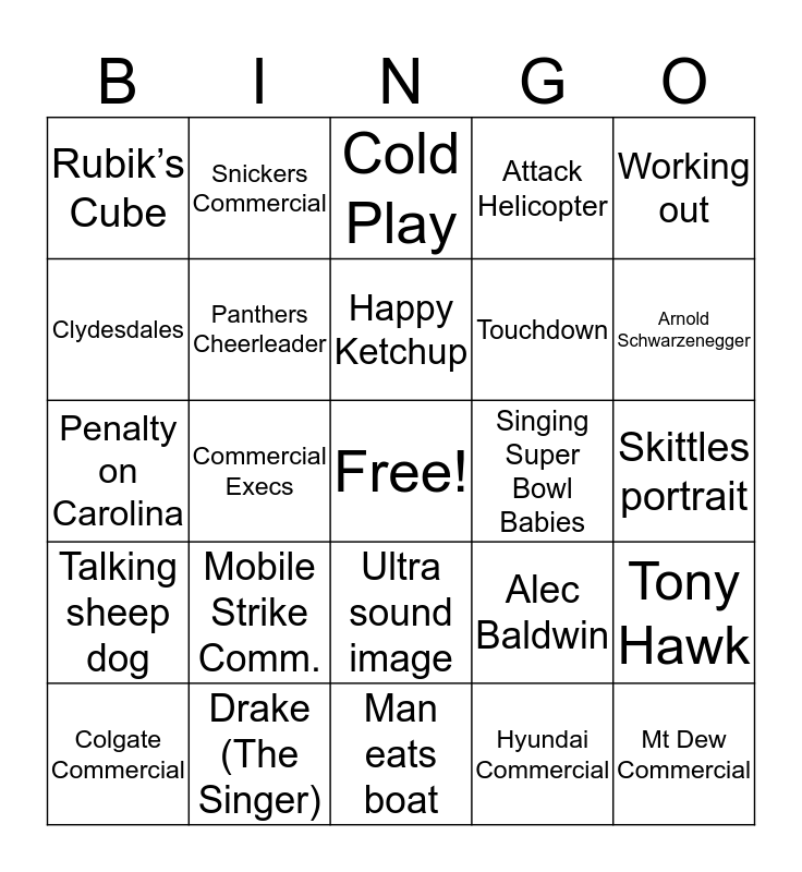 This bingo card has a free space and 24 words: Mobile Strike Comm., Drake (The Singer), Happy Ketchup, Colgate Commercial, Working out, Rubik’s Cube, Clydesdales, Snickers Commercial, Singing Super Bowl Babies, Ultra sound image, Touchdown, Penalty on Carolina, Alec Baldwin, Tony Hawk, Panthers Cheerleader, Hyundai Commercial, Skittles portrait, Cold Play, Arnold Schwarzenegger, Commercial Execs, Mt Dew Commercial, Talking sheep dog, Attack Helicopter and Man eats boat.