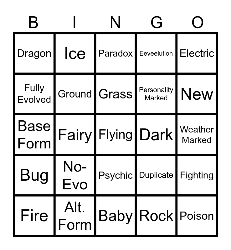 This bingo card has 30 words: Fire, Water, Grass, Normal, Electric, Dragon, Ice, Psychic, Dark, Poison, Bug, Ground, Steel, Rock, Fighting, Ghost, Fairy, Flying, Duplicate, New, Base Form, Alt. Form, Paradox, Personality Marked, Weather Marked, Fully Evolved, No-Evo, Baby, Eeveelution and Pika/Clone.