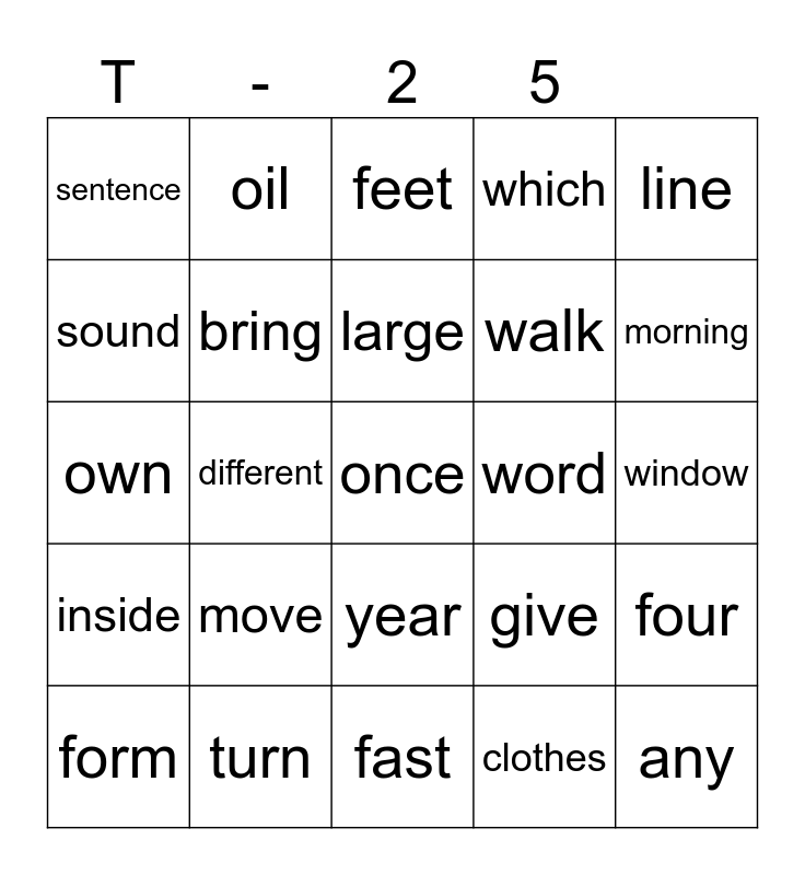 This bingo card has a free space and 24 words: move, turn, large, form, line, sentence, sound, oil, word, year, walk, own, give, four, bring, clothes, window, feet, morning, different, any, inside, which and fast.