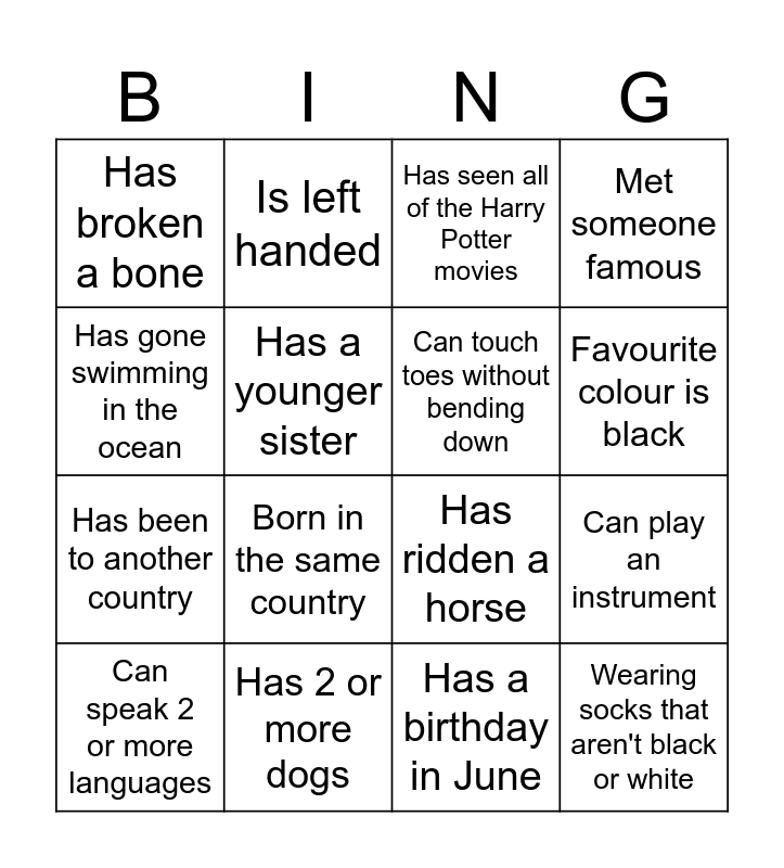 This bingo card has 16 words: Has 2 or more dogs, Can play an instrument, Has seen all of the Harry Potter movies, Has broken a bone, Has been to another country, Is left handed, Has ridden a horse, Has a birthday in June, Has gone swimming in the ocean, Has a younger sister, Can speak 2 or more languages, Met someone famous, Born in the same country, Favourite colour is black, Can touch toes without bending down and Wearing socks that aren't black or white.