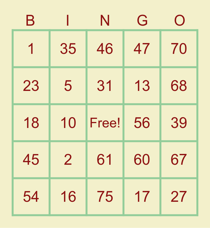 This bingo card has a free space and 24 words: 2, 16, 31, 54, 70, 1, 23, 35, 56, 61, 13, 18, 60, 67, 5, 17, 39, 46, 68, 10, 27, 45, 47 and 75.