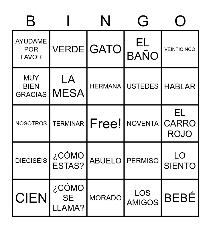 This bingo card has a free space and 25 words: ¿CÓMO ESTAS?, MORADO, HERMANA, CIEN, VEINTICINCO, AYUDAME POR FAVOR, MUY BIEN GRACIAS, VERDE, NOVENTA, ABUELO, USTEDES, NOSOTROS, PERMISO, LO SIENTO, LA MESA, UNA SILLA, EL CARRO ROJO, GATO, HABLAR, TERMINAR, BEBÉ, ¿CÓMO SE LLAMA?, DIECISÉIS, EL BAÑO and LOS AMIGOS.