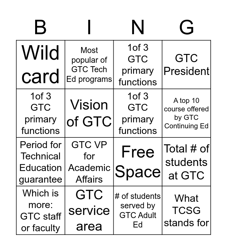 This bingo card has 16 words: GTC service area, Total # of students at GTC, 1of 3 GTC primary functions, Wild card, Period for Technical Education guarantee, Most popular of GTC Tech Ed programs, Free Space, # of students served by GTC Adult Ed, 1of 3 GTC primary functions, Vision of GTC, Which is more: GTC staff or faculty, GTC President, GTC VP for Academic Affairs, A top 10 course offered by GTC Continuing Ed, 1of 3 GTC primary functions and What TCSG stands for.