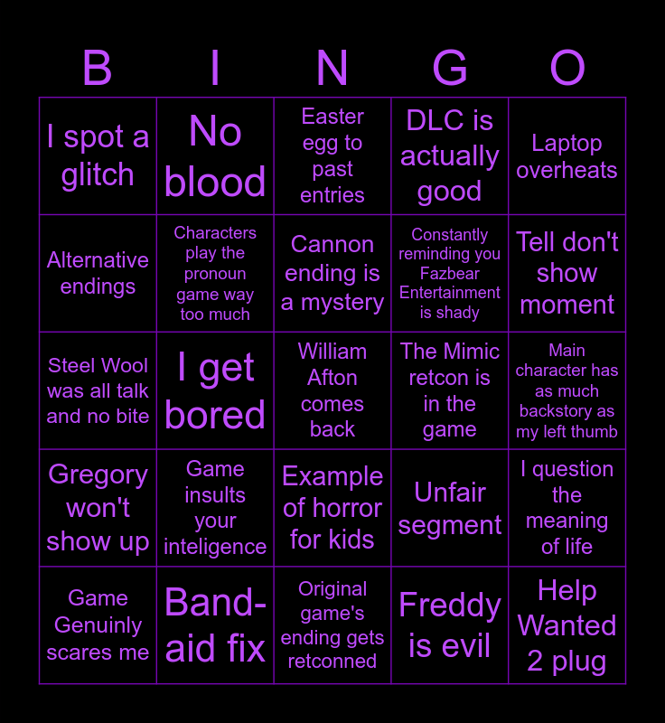 This bingo card has a free space and 29 words: Game Genuinly scares me, It takes me mental strength to keep going, I get bored, Original game story element gets retconned, I spot a glitch, Easter egg to past entries, Characters play the pronoun game way too much, Game insults your inteligence, The Mimic retcon is in the game, Band-aid fix, Main character has as much backstory as my left thumb, Help Wanted 2 plug, Original game's ending gets retconned, Freddy is evil, Tell don't show moment, Vague plot point, Example of horror for kids, Gregory won't show up, Laptop overheats, Steel Wool was all talk and no bite, Unfair segment, Siblings tell me to stop being so negative, Constantly reminding you Fazbear Entertainment is shady, Alternative endings, DLC is actually good, No blood, I question the meaning of life, Cannon ending is a mystery and Game gives you the illusion of choice.