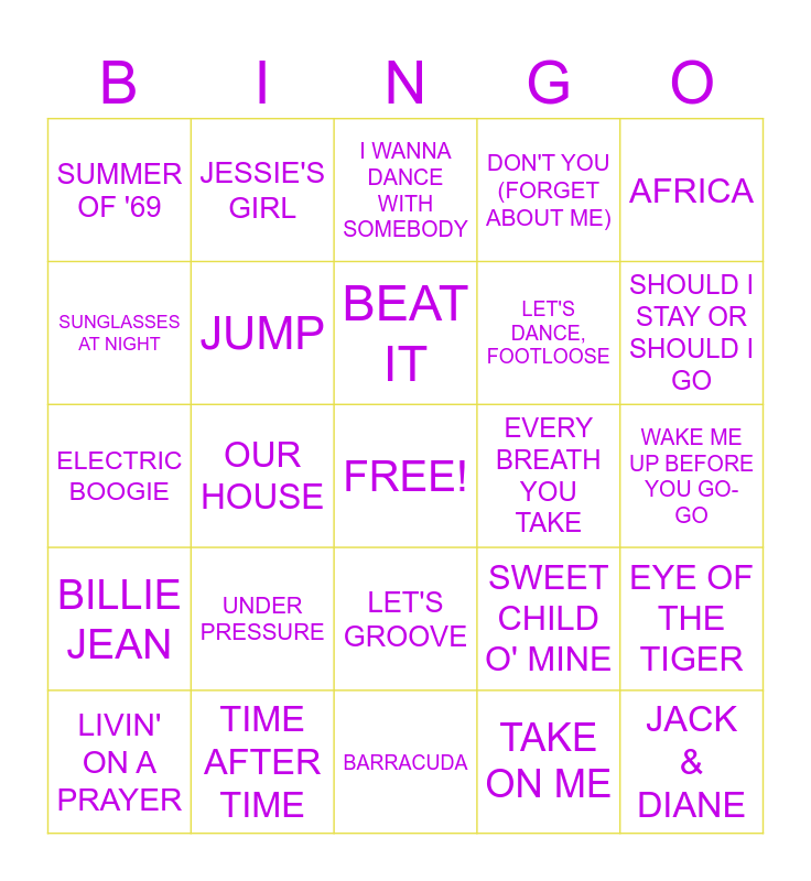 This bingo card has a free space and 34 words: PURPLE RAIN, TAKE ON ME, RED RED WINE, TAINTED LOVE, BILLIE JEAN, JUMP, AFRICA, LIVIN' ON A PRAYER, JESSIE'S GIRL, ANOTHER ONE BITES THE DUST, BEAT IT, I WANNA DANCE WITH SOMEBODY, FREE FALLIN', WHAT'S LOVE GOT TO DO WITH IT, EVERY BREATH YOU TAKE, SHOULD I STAY OR SHOULD I GO, TIME AFTER TIME, ELECTRIC BOOGIE, UNDER PRESSURE, SWEET CHILD O' MINE, LET'S GROOVE, THE FINAL COUNTDOWN, SUMMER OF '69, WAKE ME UP BEFORE YOU GO-GO, BARRACUDA, JACK & DIANE, DON'T YOU (FORGET ABOUT ME), GIRLS JUST WANNA HAVE FUN, LET'S DANCE, FOOTLOOSE, SUNGLASSES AT NIGHT, WALKING ON SUNSHINE, OUR HOUSE, EYE OF THE TIGER and LOVE SHACK.