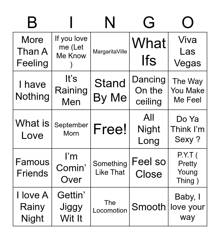 This bingo card has a free space and 66 words: America, This kiss, Burning Love, P.Y.T ( Pretty Young Thing ), Edge of Seventeen, Philadelphia Freedom, If you love me (Let Me Know ), I’m Still Standing, Stand By Me, Crazy, Something Like That, Don’t Rock the Jukebox, Do Ya Think I’m Sexy ?, Viva Las Vegas, Have Mercy, I have Nothing, September Morn, More Than A Feeling, Island In the Stream, Dancing On the ceiling, I’m Comin’ Over, Famous Friends, What Ifs, Despacito, Crazy in Love, September, The one that got Away, Under the Bridge, Baby, I love your way, Tell her About It, I love A Rainy Night, This Will Be ( An Everlasting Love), What Makes You Beautiful, Happy, Feel so Close, Gettin’ Jiggy Wit It, Glamorous, What is Love, Smooth, Cruise, It’s Raining Men, A Little Respect, All Night Long, La Isla Bonita, Beat It, The Best, The Way You Make Me Feel, Hurt So Good, You Sexy Thing, The Twist, Sugar Sugar, I Can’t Help Myself ( Sugar Pie, Honey Bunch..), Believe, MMMBOP, The Sign, Brick House, Pressure Down, Electric Boogie, MargaritaVille, The Locomotion, Kiss On My Hit List, Love Myself, This is How We Do, Your Mama Don’t Dance, I’m The One and Rhythm Is Gonna Get You.