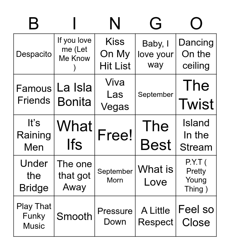 This bingo card has a free space and 65 words: America, This kiss, Burning Love, P.Y.T ( Pretty Young Thing ), Edge of Seventeen, Philadelphia Freedom, If you love me (Let Me Know ), I’m Still Standing, Viva Las Vegas, Have Mercy, September Morn, More Than A Feeling, Island In the Stream, Dancing On the ceiling, I’m Comin’ Over, Famous Friends, What Ifs, Despacito, Crazy in Love, September, The one that got Away, Under the Bridge, Baby, I love your way, Tell her About It, I love A Rainy Night, This Will Be ( An Everlasting Love), What Makes You Beautiful, Happy, Feel so Close, Gettin’ Jiggy Wit It, Play That Funky Music, Fame, Le Freak, Glamorous, What is Love, Smooth, Cruise, It’s Raining Men, A Little Respect, All Night Long, La Isla Bonita, Beat It, The Best, The Way You Make Me Feel, Hurt So Good, You Sexy Thing, The Twist, Sugar Sugar, I Can’t Help Myself ( Sugar Pie, Honey Bunch..), Believe, MMMBOP, The Sign, Brick House, Pressure Down, Electric Boogie, MargaritaVille, The Locomotion, Kiss On My Hit List, Daydream Believer, Two Hearts, Love Myself, This is How We Do, Your Mama Don’t Dance, I’m The One and Rhythm Is Gonna Get You.