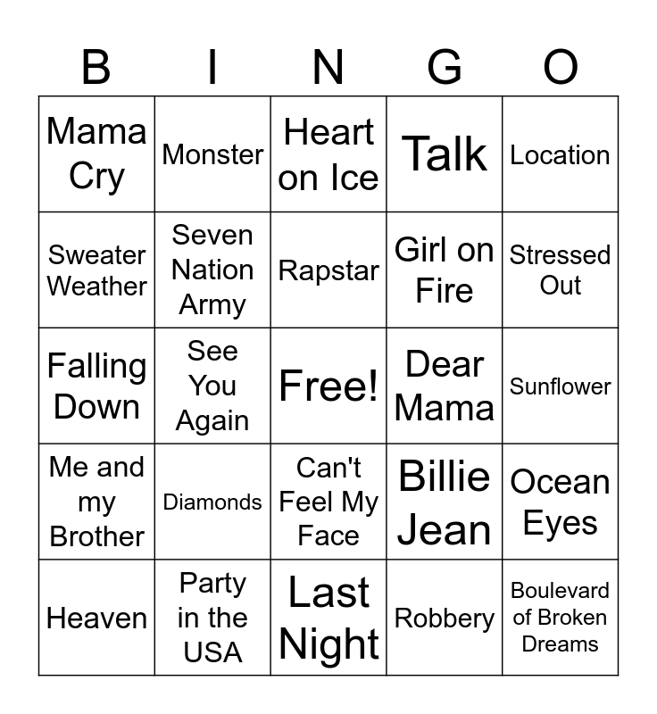 This bingo card has a free space and 24 words: Diamonds, Party in the USA, Rapstar, Heaven, Location, Mama Cry, Sweater Weather, Monster, Dear Mama, Can't Feel My Face, Girl on Fire, Falling Down, Billie Jean, Ocean Eyes, Seven Nation Army, Robbery, Sunflower, Heart on Ice, Stressed Out, See You Again, Boulevard of Broken Dreams, Me and my Brother, Talk and Last Night.