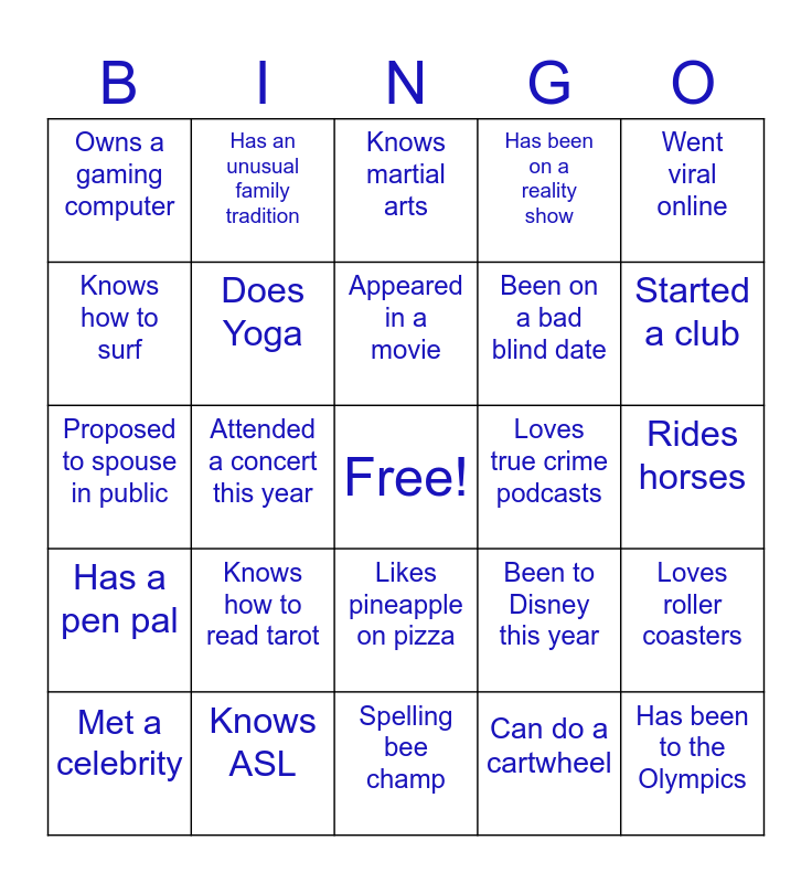 This bingo card has a free space and 24 words: Knows how to read tarot, Knows ASL, Appeared in a movie, Met a celebrity, Went viral online, Owns a gaming computer, Knows how to surf, Has an unusual family tradition, Loves true crime podcasts, Likes pineapple on pizza, Been on a bad blind date, Proposed to spouse in public, Been to Disney this year, Loves roller coasters, Does Yoga, Can do a cartwheel, Rides horses, Knows martial arts, Started a club, Attended a concert this year, Has been to the Olympics, Has a pen pal, Has been on a reality show and Spelling bee champ.