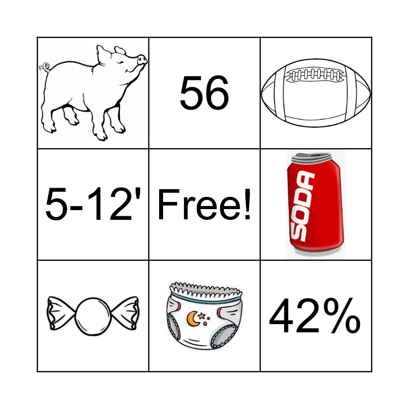This bingo card has 7 images, a free space and 4 words: False, 42%, 56 and 5-12'.