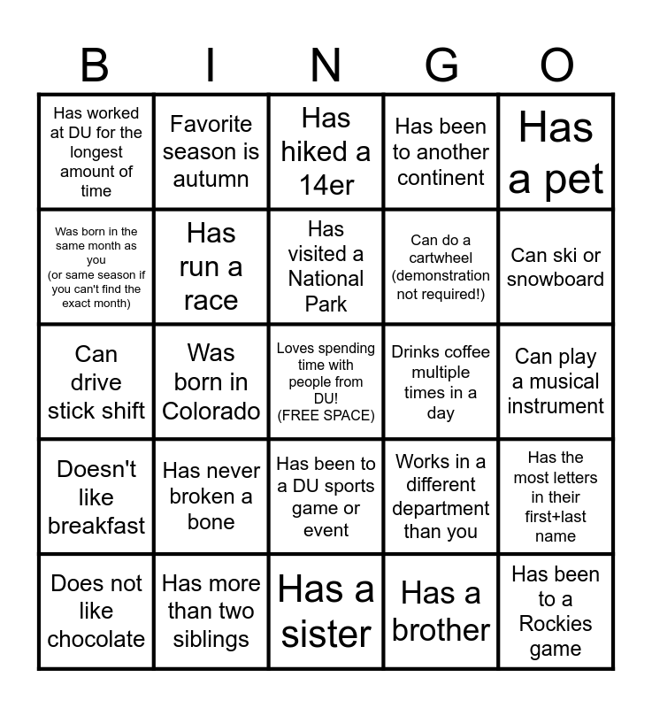 This bingo card has a free space and 24 words: Has never broken a bone, Has more than two siblings, Has visited a National Park, Does not like chocolate, Has a pet, Has worked at DU for the longest amount of time, Was born in the same month as you (or same season if you can't find the exact month), Favorite season is autumn, Drinks coffee multiple times in a day, Has been to a DU sports game or event, Can do a cartwheel (demonstration not required!), Can drive stick shift, Works in a different department than you, Has the most letters in their first+last name, Has run a race, Has a brother, Can play a musical instrument, Has hiked a 14er, Can ski or snowboard, Was born in Colorado, Has been to a Rockies game, Doesn't like breakfast, Has been to another continent and Has a sister.