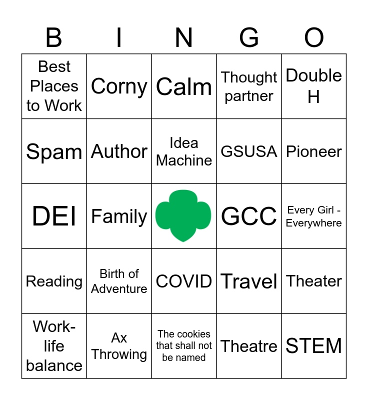This bingo card has a free space and 36 words: Leader, Pickle Doritos, Listener, Author, Travel, Reading, Idea Machine, 4 day work week!, Double H, Movie nights, Family, Thought partner, Nutmeg, GCC, Pioneer, Best Places to Work, Open Door, Birth of Adventure, STEM, Calm, Every Girl - Everywhere, Theater, Ax Throwing, Work-life balance, The cookies that shall not be named, Corny, DEI, Canada, GSUSA, Spam, Shortbread, Musicals, Theatre, COVID, CEO Patch and Innovator.