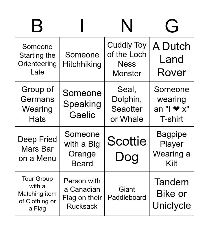 This bingo card has 20 words: Bagpipe Player Wearing a Kilt, Cuddly or Real Highland Cow with a Bell, Cuddly Toy of the Loch Ness Monster, One of us gets Disqualified from an Orienteering Event, Tour Group with a Matching item of Clothing or a Flag, Group of Germans Wearing Hats, Person with a Canadian Flag on their Rucksack, Someone Starting the Orienteering Late, Deep Fried Mars Bar on a Menu, Someone Hitchhiking, Someone with a Big Orange Beard, Scottie Dog, Someone Speaking Gaelic, Tandem Bike or Uniclycle, Seal, Dolphin, Seaotter or Whale, Someone with Pink Hair, Someone wearing an "I ❤ x" T-shirt, A Dutch Land Rover, Giant Paddleboard and Non-Orienteers in the Orienteering Area.