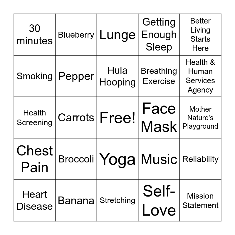 This bingo card has a free space and 24 words: Heart Disease, Broccoli, Hula Hooping, Self-Love, Better Living Starts Here, 30 minutes, Blueberry, Lunge, Face Mask, Mother Nature's Playground, Health Screening, Pepper, Music, Reliability, Smoking, Banana, Stretching, Getting Enough Sleep, Health & Human Services Agency, Chest Pain, Carrots, Yoga, Breathing Exercise and Mission Statement.
