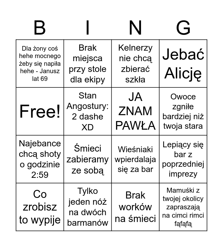 This bingo card has 16 words: Tylko jeden nóż na dwóch barmanów, Lepiący się bar z poprzedniej imprezy, Kelnerzy nie chcą zbierać szkła, Dla żony coś hehe mocnego żeby się napiła hehe - Janusz lat 69, Najebance chcą shoty o godzinie 2:59, Brak miejsca przy stole dla ekipy, Wieśniaki wpierdalaja się za bar, Brak worków na śmieci, Free!, Stan Angostury: 2 dashe XD, Co zrobisz to wypije, Jebać Alicję, Śmieci zabieramy ze sobą, Owoce zgniłe bardziej niż twoja stara, JA ZNAM PAWŁA and Mamuśki z twojej okolicy zapraszają na cimci rimci fąfąfą.