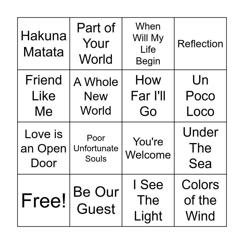 This bingo card has 23 words: Colors of the Wind, Let It Go, Un Poco Loco, Into The Unknown, Friend Like Me, Hakuna Matata, A Whole New World, Part of Your World, Free!, Surface Pressure, Poor Unfortunate Souls, Love is an Open Door, Almost There, We Don't Talk About Bruno, Be Our Guest, Once Upon a Dream, When Will My Life Begin, You're Welcome, How Far I'll Go, Under The Sea, Reflection, I See The Light and The Bare Necessities.