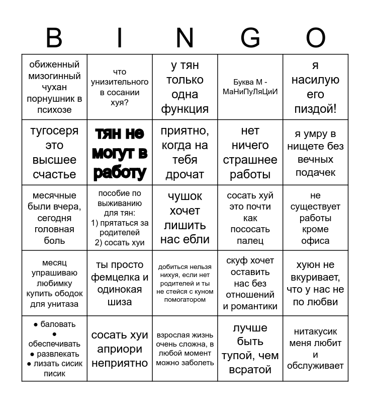 This bingo card has a free space and 24 words: ты просто фемцелка и одинокая шиза, сосать хуи априори неприятно, приятно, когда на тебя дрочат, ● баловать ● обеспечивать ● развлекать ● лизать сисик писик, я насилую его пиздой!, обиженный мизогинный чухан порнушник в психозе, тугосеря это высшее счастье, что унизительного в сосании хуя?, сосать хуй это почти как пососать палец, добиться нельзя нихуя, если нет родителей и ты не стейся с куном помогатором, нет ничего страшнее работы, месячные были вчера, сегодня головная боль, скуф хочет оставить нас без отношений и романтики, хуюн не вкуривает, что у нас не по любви, тян не могут в работу, лучше быть тупой, чем всратой, не существует работы кроме офиса, у тян только одна функция, я умру в нищете без вечных подачек, пособие по выживанию для тян: 1) прятаться за родителей 2) сосать хуи, нитакусик меня любит и обслуживает, месяц упрашиваю любимку купить ободок для унитаза, Буква М - МаНиПуЛяЦиИ and взрослая жизнь очень сложна, в любой момент можно заболеть.