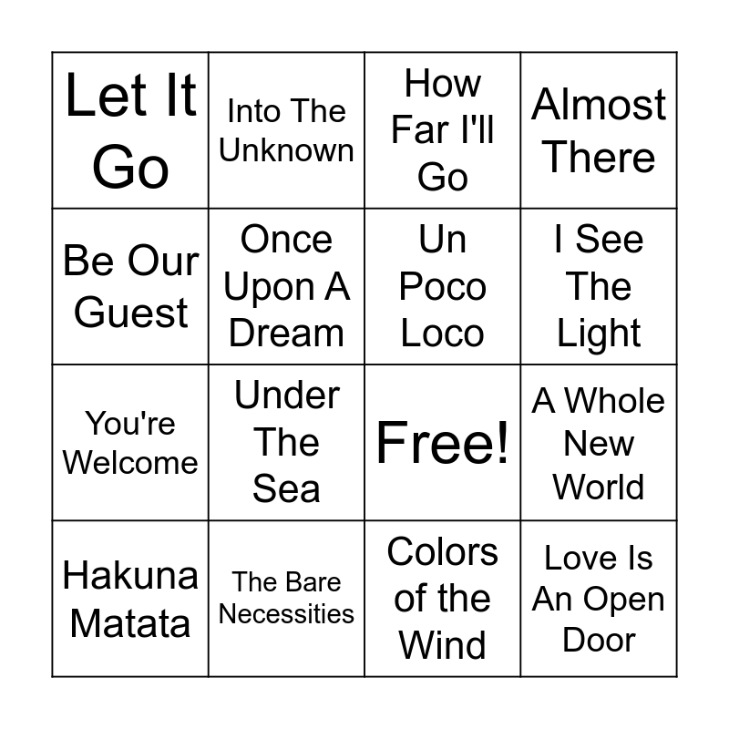 This bingo card has 22 words: The Bare Necessities, Part of Your World, Into The Unknown, When Will My Life Begin, Once Upon A Dream, Un Poco Loco, Let It Go, How Far I'll Go, Free!, Love Is An Open Door, You're Welcome, Almost There, Friend Like Me, Surface Pressure, Colors of the Wind, Reflection, A Whole New World, Hakuna Matata, Under The Sea, Be Our Guest, I See The Light and Poor Unfortunate Souls.