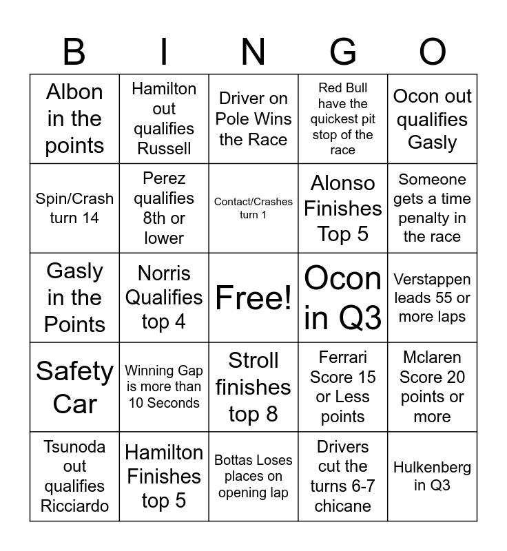 This bingo card has a free space and 27 words: Ferrari Score 15 or Less points, Crash in Qualifying, Alonso Finishes Top 5, Bottas Loses places on opening lap, Spin/Crash turn 14, Driver on Pole Wins the Race, Hamilton out qualifies Russell, Safety Car, Ocon in Q3, Mclaren Score 20 points or more, Gasly in the Points, Red Bull have the quickest pit stop of the race, Tsunoda out qualifies Ricciardo, Hamilton Finishes top 5, Someone gets a time penalty in the race, Zhou out in Q1, Perez qualifies 8th or lower, Contact/Crashes turn 1, Winning Gap is more than 10 Seconds, Albon in the points, Verstappen leads 55 or more laps, Drivers cut the turns 6-7 chicane, Norris Qualifies top 4, Hulkenberg in Q3, Stroll finishes top 8, Ocon out qualifies Gasly and Alonso Gains positions in first lap.