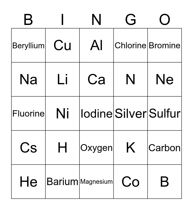 This bingo card has 25 words: H, Magnesium, Ca, He, Bromine, Beryllium, Na, Cu, Silver, Oxygen, N, Fluorine, K, Carbon, Li, B, Sulfur, Al, Ne, Ni, Iodine, Barium, Cs, Chlorine and Co.