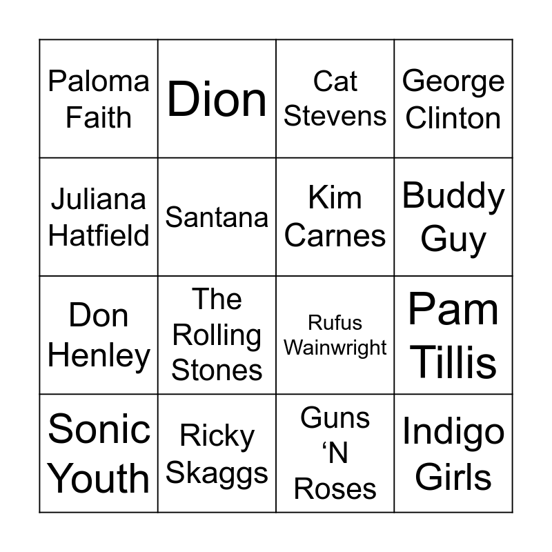 This bingo card has 22 words: Ricky Skaggs, Martha & the Vandellas, Dion, Brian Auger & the Trinity, Santana, Kim Carnes, Paloma Faith, Cat Stevens, Rufus Wainwright, Indigo Girls, Don Henley, George Clinton, Travis, Alison Krauss & Union Sation, Guns ‘N Roses, Jennifer Lopez, Pam Tillis, Sonic Youth, The Rolling Stones, Juliana Hatfield, Buddy Guy and Selena Gomez.