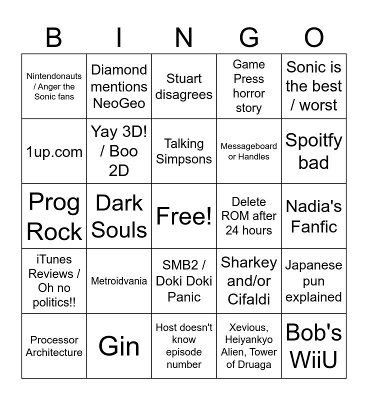 This bingo card has a free space and 24 words: Metroidvania, Gin, Talking Simpsons, Processor Architecture, Sonic is the best / worst, Nintendonauts / Anger the Sonic fans, 1up.com, Diamond mentions NeoGeo, Delete ROM after 24 hours, SMB2 / Doki Doki Panic, Messageboard or Handles, Prog Rock, Sharkey and/or Cifaldi, Japanese pun explained, Yay 3D! / Boo 2D, Xevious, Heiyankyo Alien, Tower of Druaga, Nadia's Fanfic, Stuart disagrees, Spoitfy bad, Dark Souls, Bob's WiiU, iTunes Reviews / Oh no politics!!, Game Press horror story and Host doesn't know episode number.