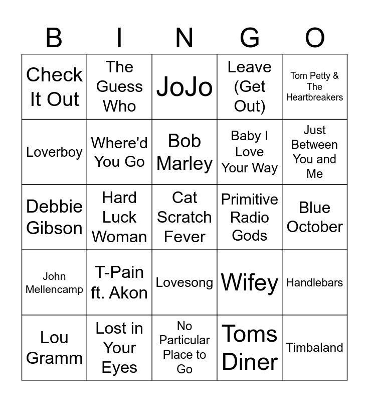 This bingo card has 90 words: Lump, Presidents of the USA, Lovesong, The Cure, The Rhythm of the Night (1993), Corona, Remedy, Black Crowes, Jimmy Ray, Are You Jimmy Ray?, Space Age Love Song, A Flock of Seagulls, Hate Me, Blue October, Redemption Song, Bob Marley, I Alone, Live, Cuts Like a Knife, Bryan Adams, Wall to Wall, Chris Brown, No Particular Place to Go, Chuck Berry, Debbie Gibson, Lost in Your Eyes, Hysteria, Def Leppard, Rhythm of the Night (1985), Wipeout, Fat Boys and the Beach Boys, Handlebars, Flobots, John Mellencamp, Check It Out, Leave (Get Out), JoJo, Kiss, Hard Luck Woman, Just Between You and Me, Lou Gramm, Loverboy, Lovin' Every Minute of It, Pop Goes the World, Men Without Hats, Wifey, Next, Hella Good, No Doubt, Dead Man's Party, Oingo Bingo, Baby I Love Your Way, Peter Frampton, Phil Collins, Do You Remember, Standing Outside a Broken Phone Booth With Money In My Hand, Primitive Radio Gods, R.E.M., Stand, Only The Lonely, Roy Orbison, Little Miss Can't Be Wrong, Spin Doctors, Steve Miller Band, Jungle Love, High on You, Survivor, Toms Diner, Suzanne Vega, Bartender, T-Pain ft. Akon, Cat Scratch Fever, Ted Nugent, Share The Land, The Guess Who, Where'd You Go, The Mighty Mighty Bosstones, Tiffany, Could've Been, The Way I Are, Timbaland, Tom Petty & The Heartbreakers, Handle With Care, Traveling Wilbury's, Walk Like a Man, Frankie Valli and the Four Seasons, El Debarge, Learning To Fly, Cathy Dennis and Too Many Walls.