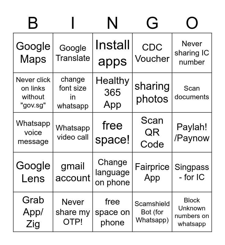This bingo card has a free space and 24 words: Grab App/ Zig, gmail account, Healthy 365 App, Scamshield Bot (for Whatsapp), Never sharing IC number, Google Maps, Google Translate, Install apps, Scan QR Code, Paylah! /Paynow, Whatsapp voice message, change font size in whatsapp, Fairprice App, Singpass - for IC, Never click on links without "gov.sg", Never share my OTP!, free space on phone, CDC Voucher, Scan documents, Google Lens, Whatsapp video call, Change language on phone, sharing photos and Block Unknown numbers on whatsapp.