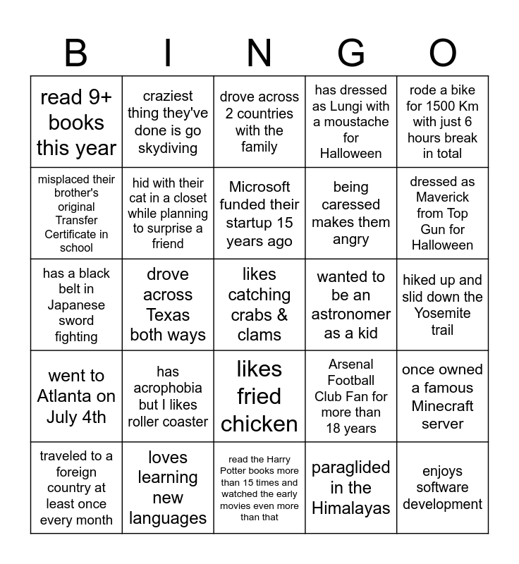 This bingo card has 25 words: has acrophobia but I likes roller coaster, read the Harry Potter books more than 15 times and watched the early movies even more than that, Microsoft funded their startup 15 years ago, traveled to a foreign country at least once every month, rode a bike for 1500 Km with just 6 hours break in total, read 9+ books this year, misplaced their brother's original Transfer Certificate in school, craziest thing they've done is go skydiving, wanted to be an astronomer as a kid, likes fried chicken, being caressed makes them angry, has a black belt in Japanese sword fighting, Arsenal Football Club Fan for more than 18 years, once owned a famous Minecraft server, hid with their cat in a closet while planning to surprise a friend, enjoys software development, hiked up and slid down the Yosemite trail, drove across 2 countries with the family, dressed as Maverick from Top Gun for Halloween, drove across Texas both ways, likes catching crabs & clams, loves learning new languages, went to Atlanta on July 4th, has dressed as Lungi with a moustache for Halloween and paraglided in the Himalayas.
