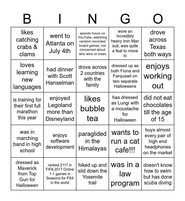 This bingo card has 25 words: enjoys software development, hiked up and slid down the Yosemite trail, drove across 2 countries with the family, dressed as Maverick from Top Gun for Halloween, drove across Texas both ways, likes catching crabs & clams, loves learning new languages, went to Atlanta on July 4th, has dressed as Lungi with a moustache for Halloween, paraglided in the Himalayas, dressed up as both Fiona and Farquaad on two separate Halloweens, is training for their first full marathon this year, wants to run a cat cafe!!!, buys almost every pair of high end headphones on the market, had dinner with Scott Hanselman, doesn't know how to swim but has done scuba diving, did not eat chocolates till the age of 15, spends hours on YouTube, watching random recorded board games; not concerned about who wins or loses, enjoys working out, enjoyed Legoland more than Disneyland, likes bubble tea, ranked 2117 in FIFA 2017 Online 1-1 games in Seasons for PS4 in the world, was in marching band in high school, wore an incredibly heavy Iron Man suit, was quite a feat to move in and was in a law program.