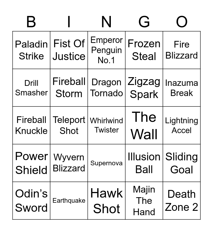 This bingo card has 75 words: Fire Tornado, God Hand, Emperor Penguin No.1, Astro Break, Atomic Flare, Coil Turn, Cosmic Shot, Cross Fire, Dark Phoenix, Dark Tornado, Death Zone 2, Dragon Crash, Dragon Tornado, Drill Smasher, Dual Smash, Teleport Shot, Moonsault, Whirlwind Twister, Eternal Blizzard, Fire Blizzard, Fire Rooster, Fireball Knuckle, Fireball Storm, Fist Of Justice, Frozen Steal, Gaia Break, Gran Fenrir, Grand Fire, Grenade Shot, Hammer Of Wrath, Ice Ground, Ignite Steal, Ijigen The Hand, Illusion Ball, Inazuma Break, Zigzag Spark, Inazuma Drop, Kung Fu Head, Lightning Accel, Majin The Hand, Megalodon, Megaton Head, Meteor Blade, Meteor Shower, Mugen The Hand, Northern Impact, Odin’s Sword, Paladin Strike, Photon Flash, Snow Angel, Space Penguin, Supernova, The Earth, Thunder Beast, Tri-Pegasus, Tri-Phoenix, Twin Boost, Unicorn Boost, Water Veil, Wormhole, Wyvern Blizzard, Wyvern Crash, Lunar Eclipse, Shot Pocket, Back Tornado, The Wall, Snake Shot, Sumo Shot, Fake Ball, Sliding Goal, Power Shield, Earthquake, Triangle Z, Hawk Shot and Heaven’s Time.